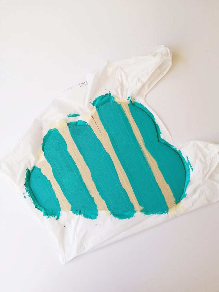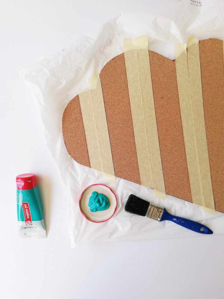 5. Depois de ter colado as fitas de papel, pinte o espaço que não está isolado com tinta acrílica da cor que preferir. Quando a tinta estiver bem seca, retire as fitas.