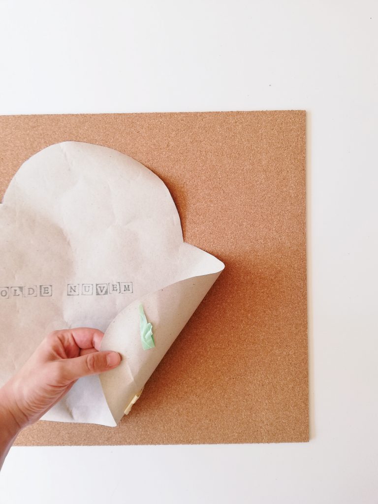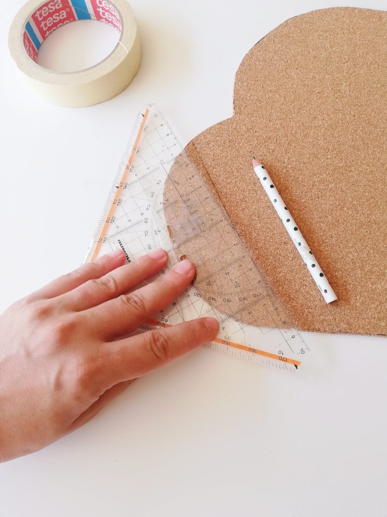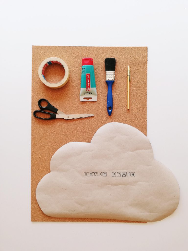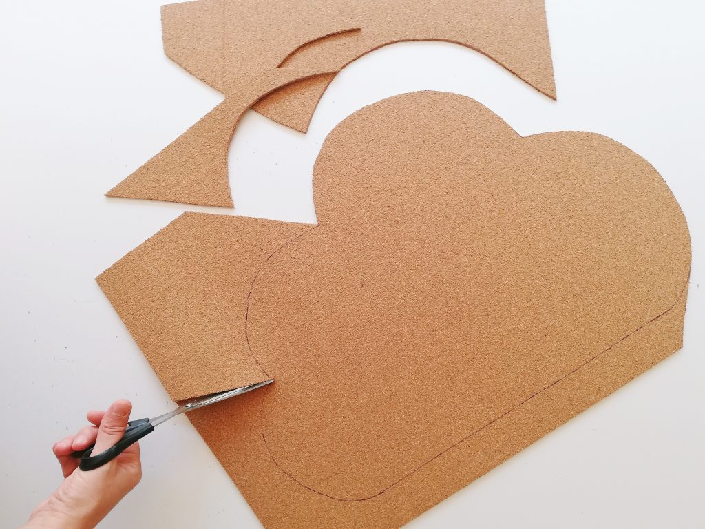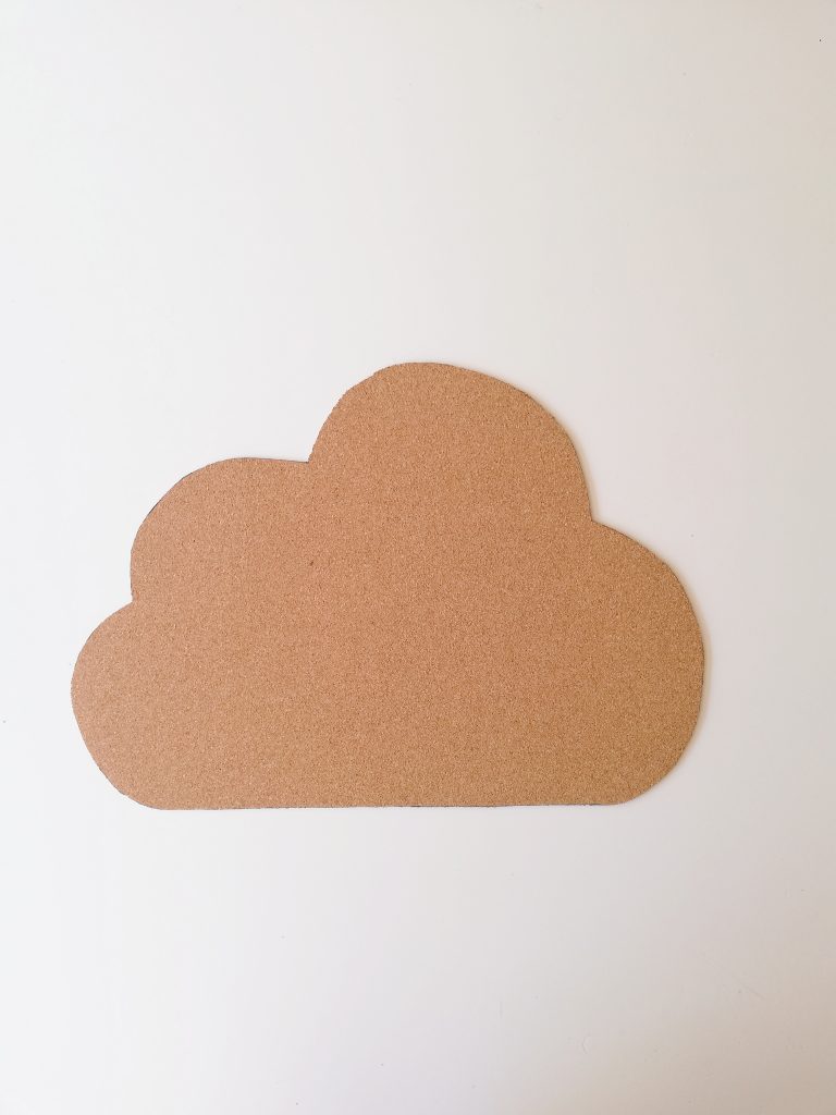 NOTAS: para este projecto pode utilizar tanto cortiça em rolo como placas já cortadas de cortiça. As placas acabam por ser mais práticas, pois não precisam ser planadas. Caso utilize cortiça em rolo, deverá cortar um pedaço de X por X e plana-lo antes de o utilizar. Para tal, basta colocar a cortiça sobre livros pesados durante mais ou menos 48h. Depois, a cortiça estará pronta a cortar em forma de nuvem.