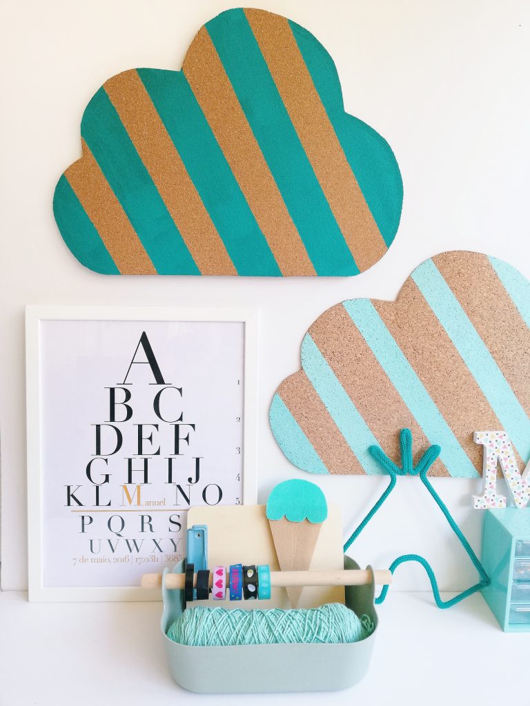 Miúdos, tarefas, notas coisas para fazer e que não podem ficar penduradas. Não há nada melhor do que um quadro de cortiça para fixar tudo e eles, e nós, não nos esquecermos de nada. Se aliarmos isto À decoração do espaço deles o processo torna-se mais divertido e menos maçador. Juntando a isso uma pitada de DIY então é ouro sobre azul.