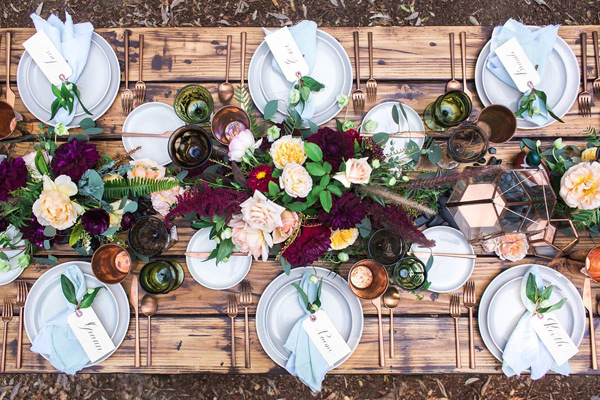 Dê elegância à sua mesa usando materiais diferentes e mais vistosos, flores e tons mais escuros.