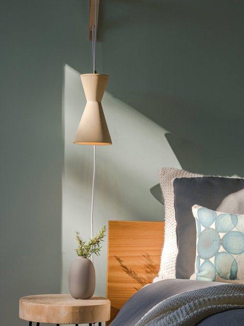 “Criado a pensar nas pessoas que admiram a simplicidade, equilibra os contornos da sua forma simples com os acabamentos pastel e neutros das suas cores. Um candeeiro versátil que pode ser usado sozinho ou agrupado, e que pode para além de tecto, ser usado na parede, fornecido com uma poleia de madeira que permite que a luz seja ajustada a qualquer altura. Ideal para uma mesa de cabeceira ou pequeno canto de leitura visto que, a profundidade da sua forma evita o brilho e emite uma luz suave.”